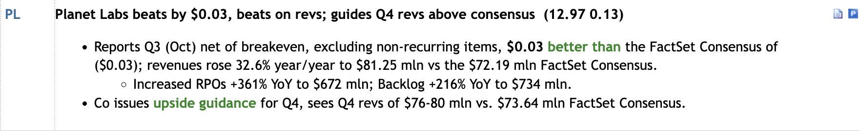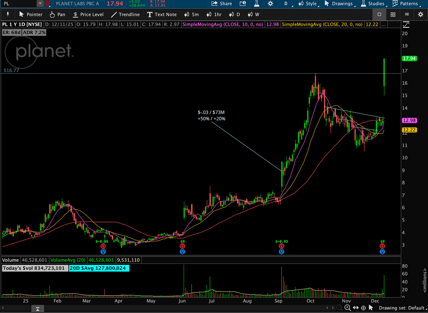 PL the PEG of the day. Has all of the characteristics of a good earnings breakout. Coupled with the pick up in space theme.
