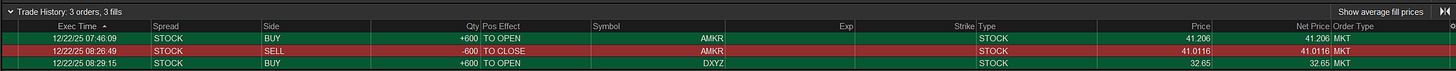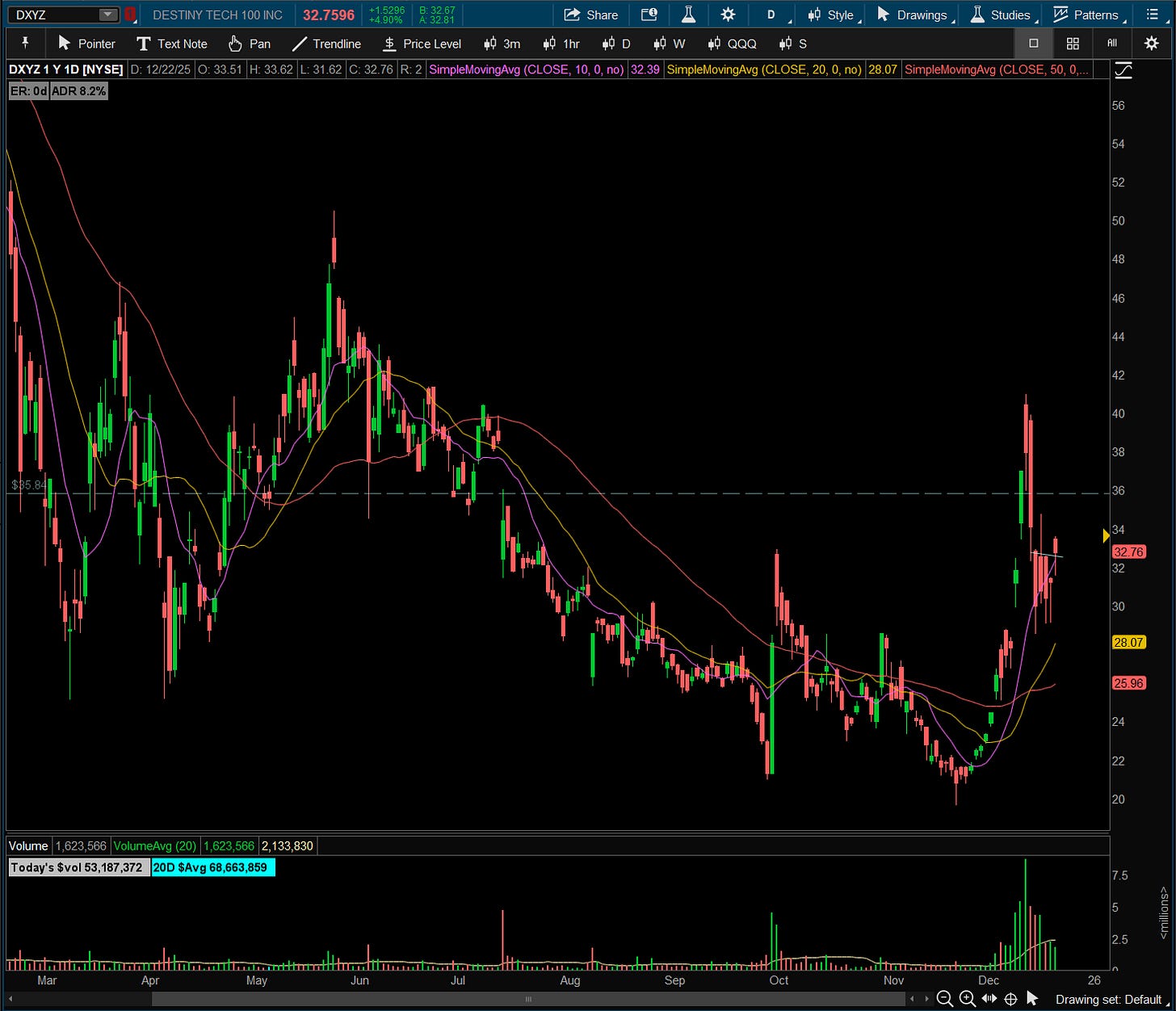 With space theme in full effect, I found an entry on this name as it crossed back up the range break I was interested in at around $32.60. Stop remains at LOD. DXYZ isn’t a quality name, but it is in theme which makes it part of my stock selection criteria.