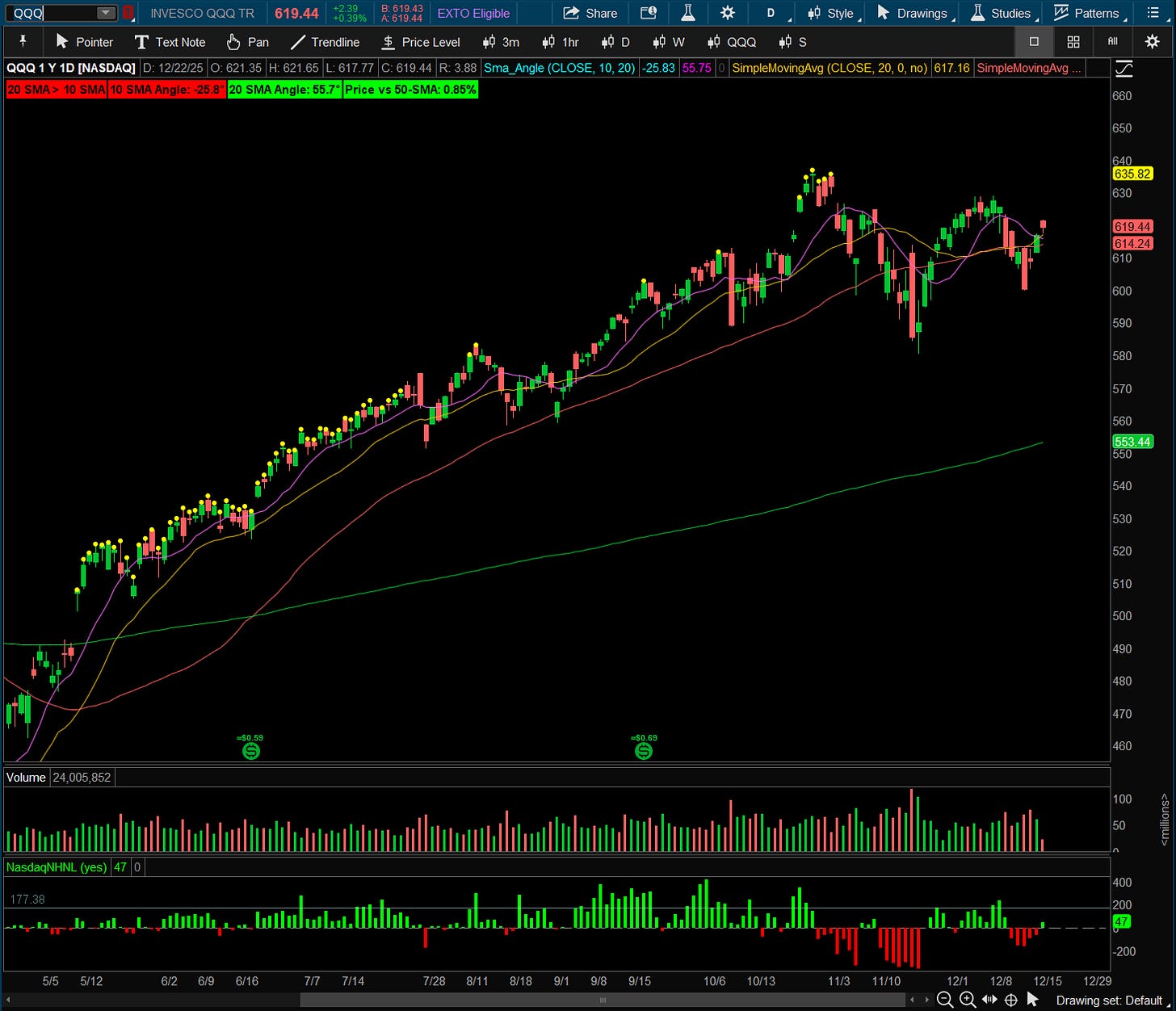 The index gapped up today above the 10 and 20 and pulled back in the morning session. Most of the stocks that broke out last week held their gains with minimal selling/pullbacks.