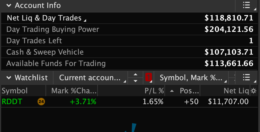 Got hit and stopped out on TSLA and PLTR gap downs. Entered RDDT.
