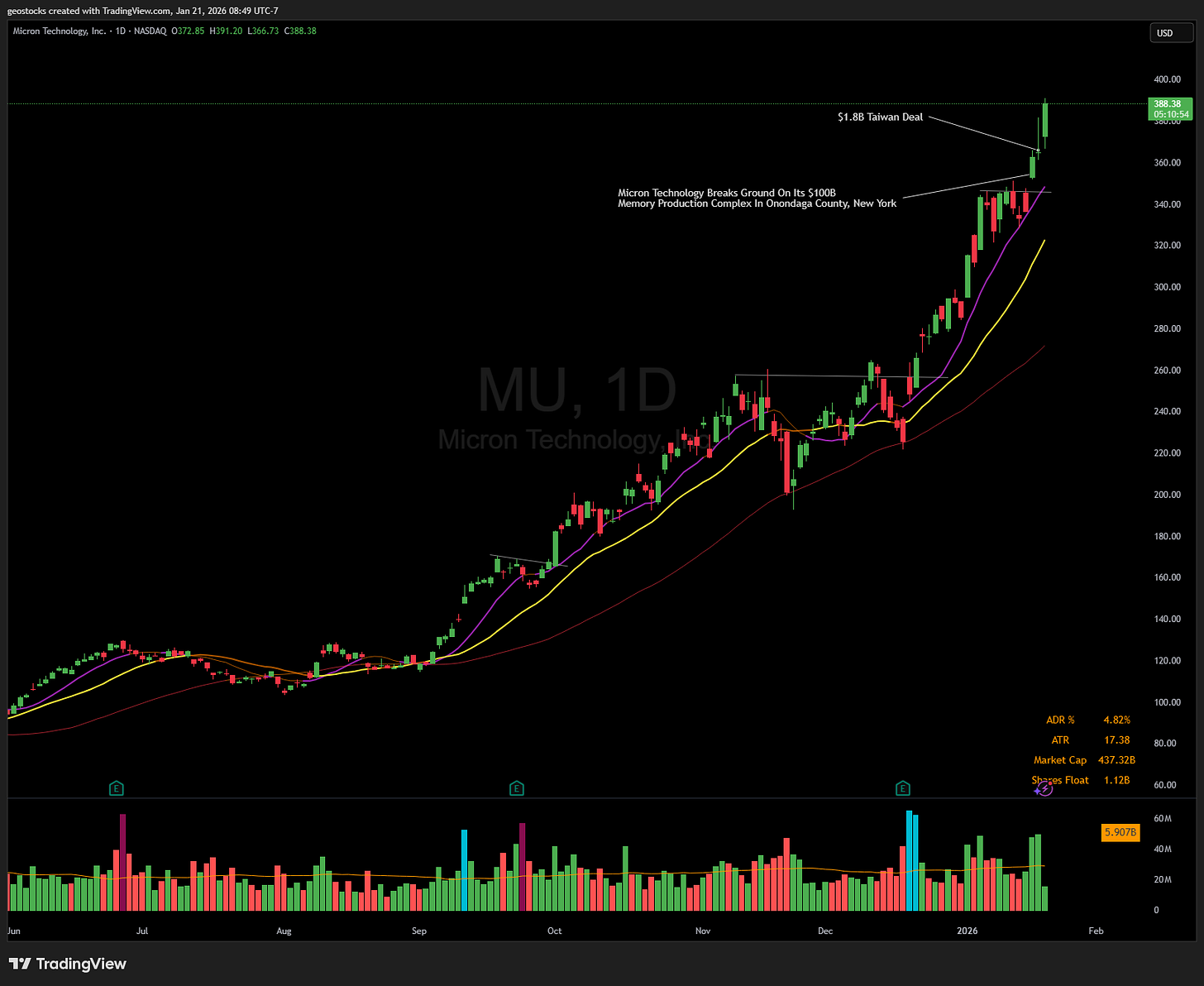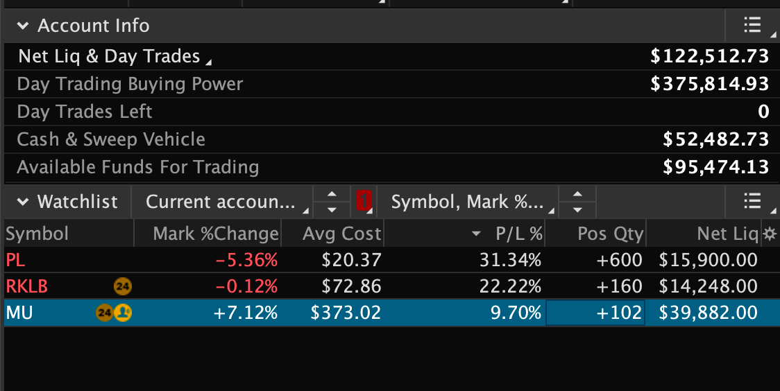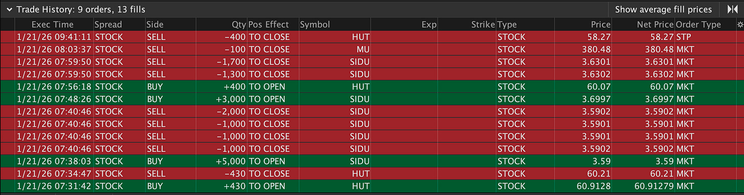 MU was my biggest position in my portfolio and for good reason. It is the leading megacap stock that is in the highest demanding theme: Memory. I was able to get a price that was 1.2% away from my initial stop on Jan 16 which allowed me to get in 60% position. In these situations I’m a little quick to derisk which I did today, so I sold half of my shares and keeping the rest and will be using a moving average to trail the rest. Ideally I can use the 20 if it gets over my average.