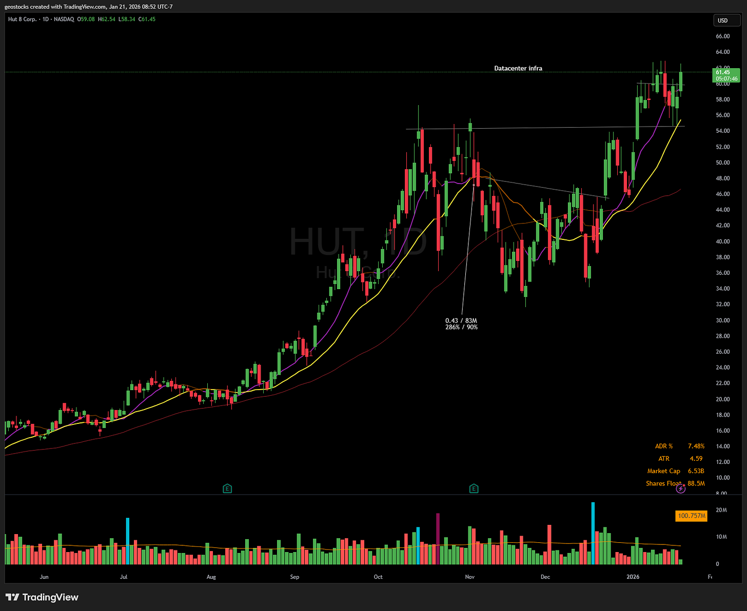 HUT I am currently bullish datacenter infrastructure stocks like HUT, APLD, RIOT, GLXY as they are all showing strength working up the right side of their bases. My first buy was shortly after the open, and quickly sold it for a small loss as it was pulling back sharply. I let it settle and bought it again as it crossed over vwap and yesterdays high.