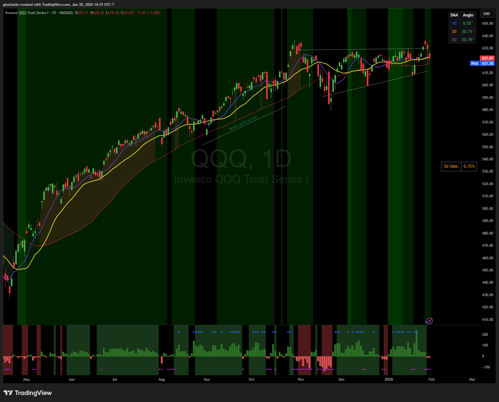 All moving averages are aligned. 10 > 20 > 50. The issue is that there is no separation in thes MA’s which generally means we are in chop.