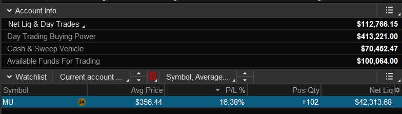 MU pulled back a bit on me but still holding my shares from 350s. Other than that, not much to do, and don’t really see anything for next week. Might be a lot of consolidation ahead, so will be taking it slow.