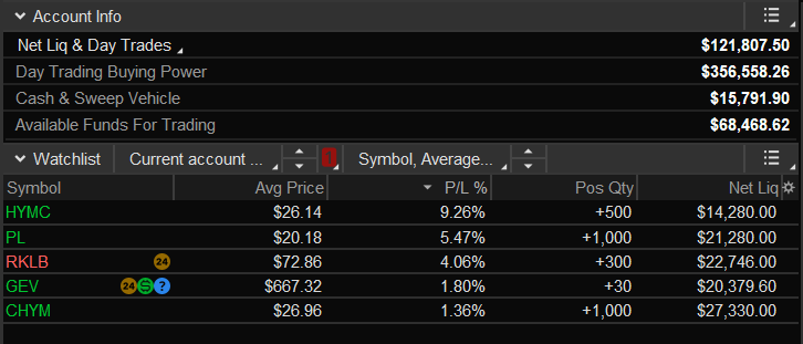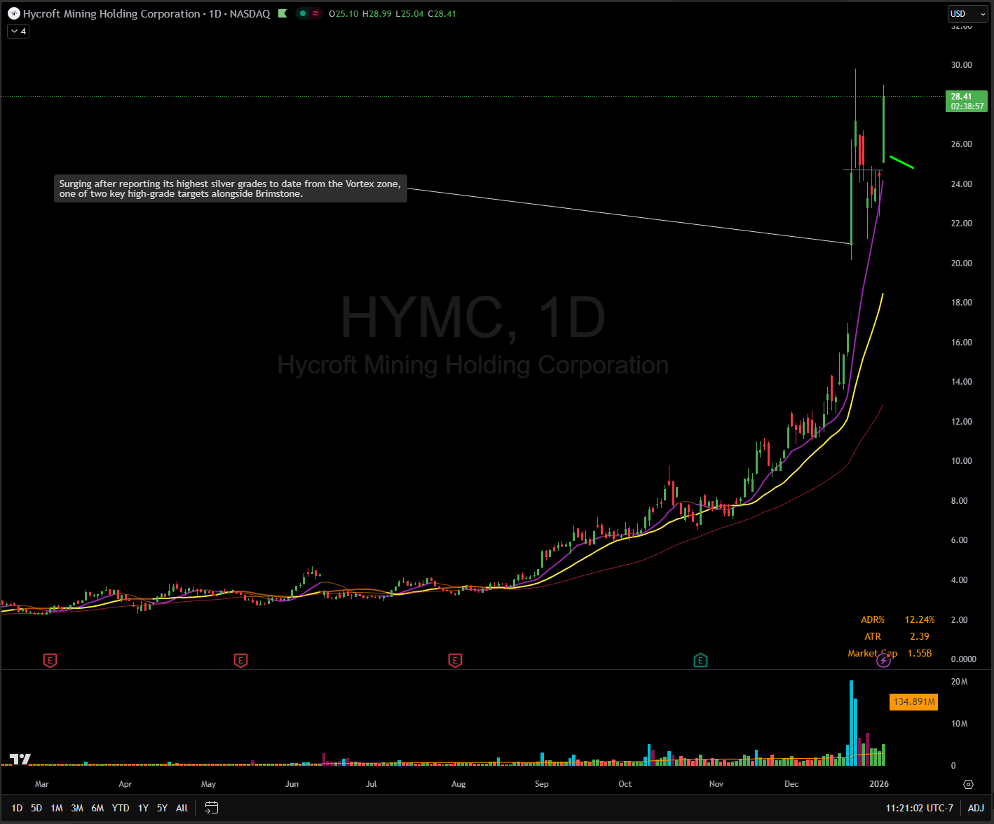 HYMC new position from today. Silver name that is moving with the entire group. Was able to sell at my first target today so will be trailing the rest of my position.