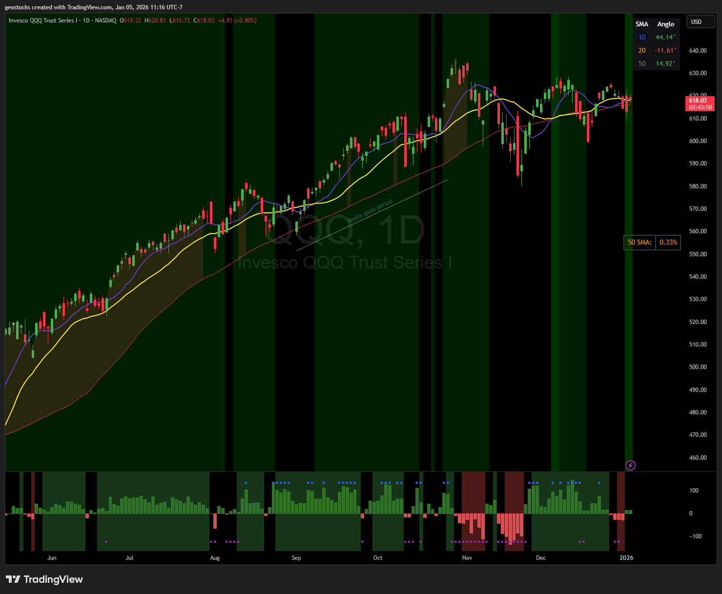 The 10 is over the 20. The angle of the 10ma and 50ma are sloping higher, the 20ma is sloping slightly down. We are still in this sort of chop phase as the index hasn’t made a meaningful move in either direction.
