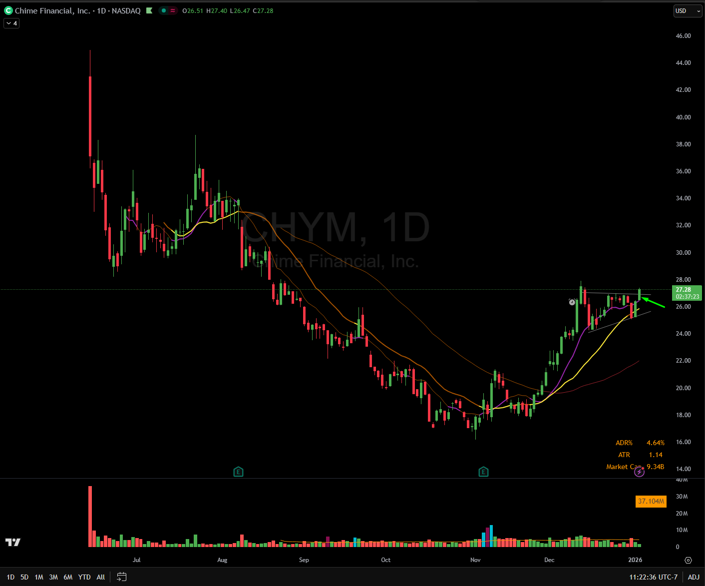 CHYM new IPO that has been basing for a couple of months. Entered the range break today.