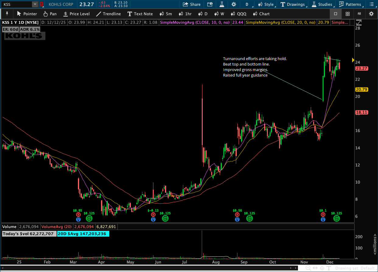 KSS is flagging and surfing the 10ma. Watching for a range break. Shares jumped following the catalyst of naming a permanent CEO and reporting better-than-expected third-quarter results, driven by improved margins and traffic.