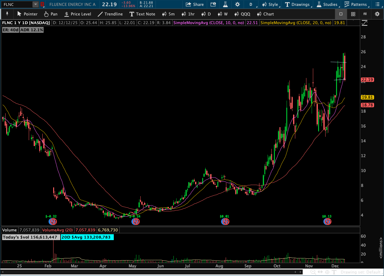 FLNC failed breakout and pulled back. Watching for a better set up. Fluence Energy’s price surged on the catalyst of strong analyst upgrades and high price target increases due to its high growth rate and better visibility into improving gross margins.