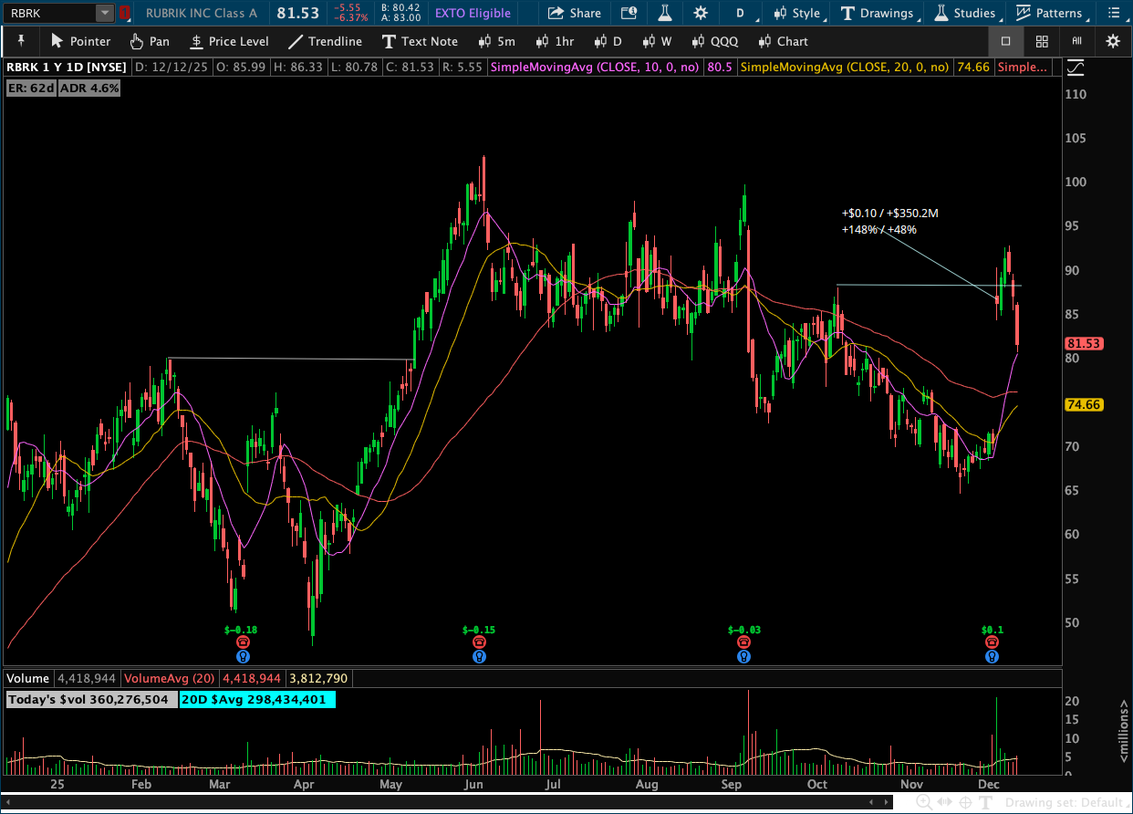 RBRK pulled back to the 10ma on blow out earnings. Kind of a choppy name unless it’s taken from the beginning of it’s move. The stock saw a massive move following the catalyst of a robust Q3 earnings beat, an inflection point to profitability, and strong growth in its Cloud Annual Recurring Revenue (ARR).
