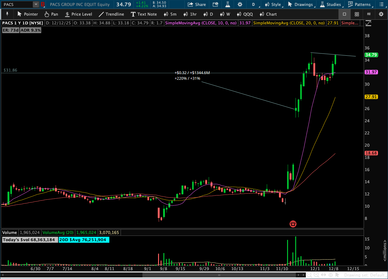 PACS pushed out off the 10ma. Will be watching to see if it puts in a bigger flag on the daily to take long. The stock has seen a significant run following its IPO, with recent strength attributed to the general story of the company’s strong revenue growth and high projected growth rates for operating and net income in the coming years.