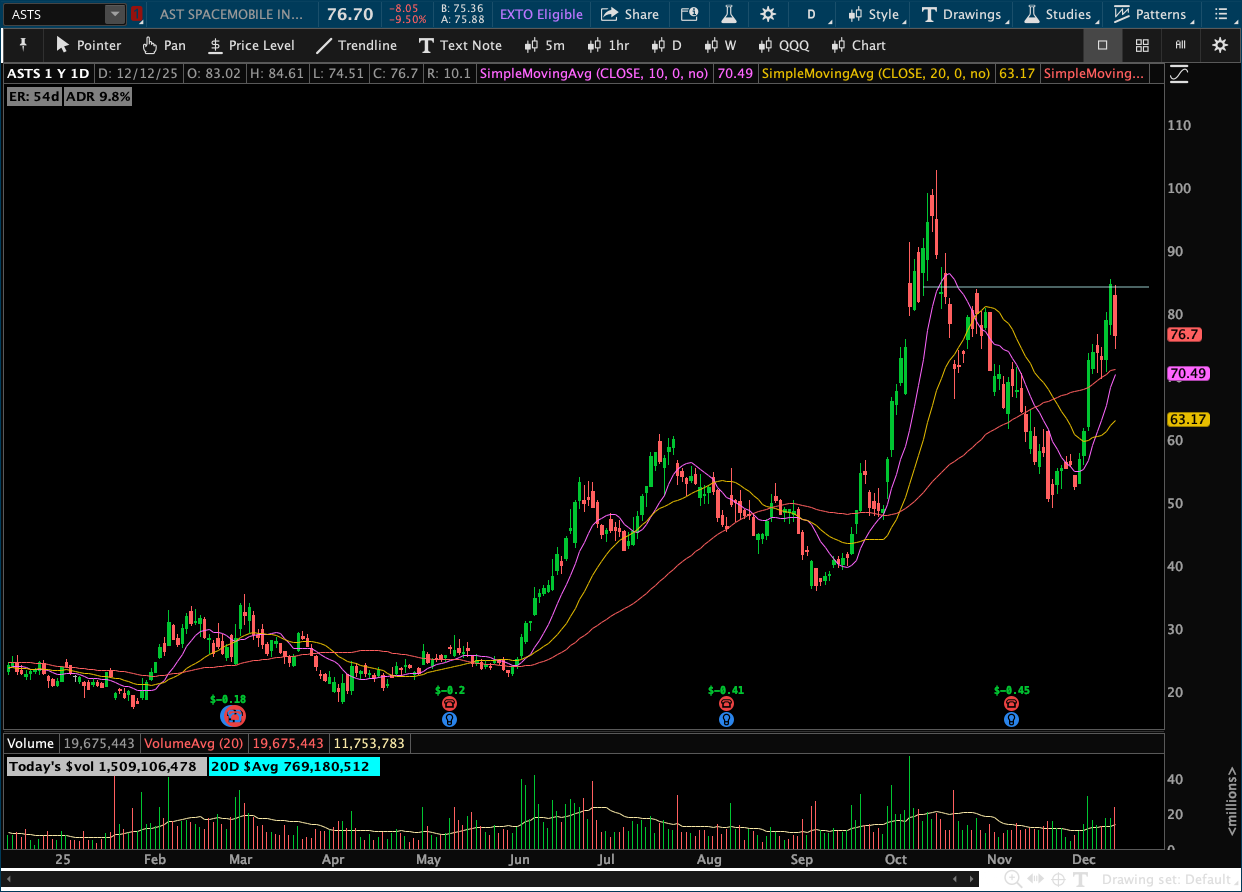 ASTS has been one of the big space theme stocks that has rallied recently. We are getting a well deserved pullback. Still in it’s base, could get a base and break above 85, or pick up off an MA if it builds a good range. The stock is driven by the exciting catalyst and long-term story of building a space-based cellular broadband network and upcoming launches like BlueBird 6 to connect unmodified mobile phones globally.