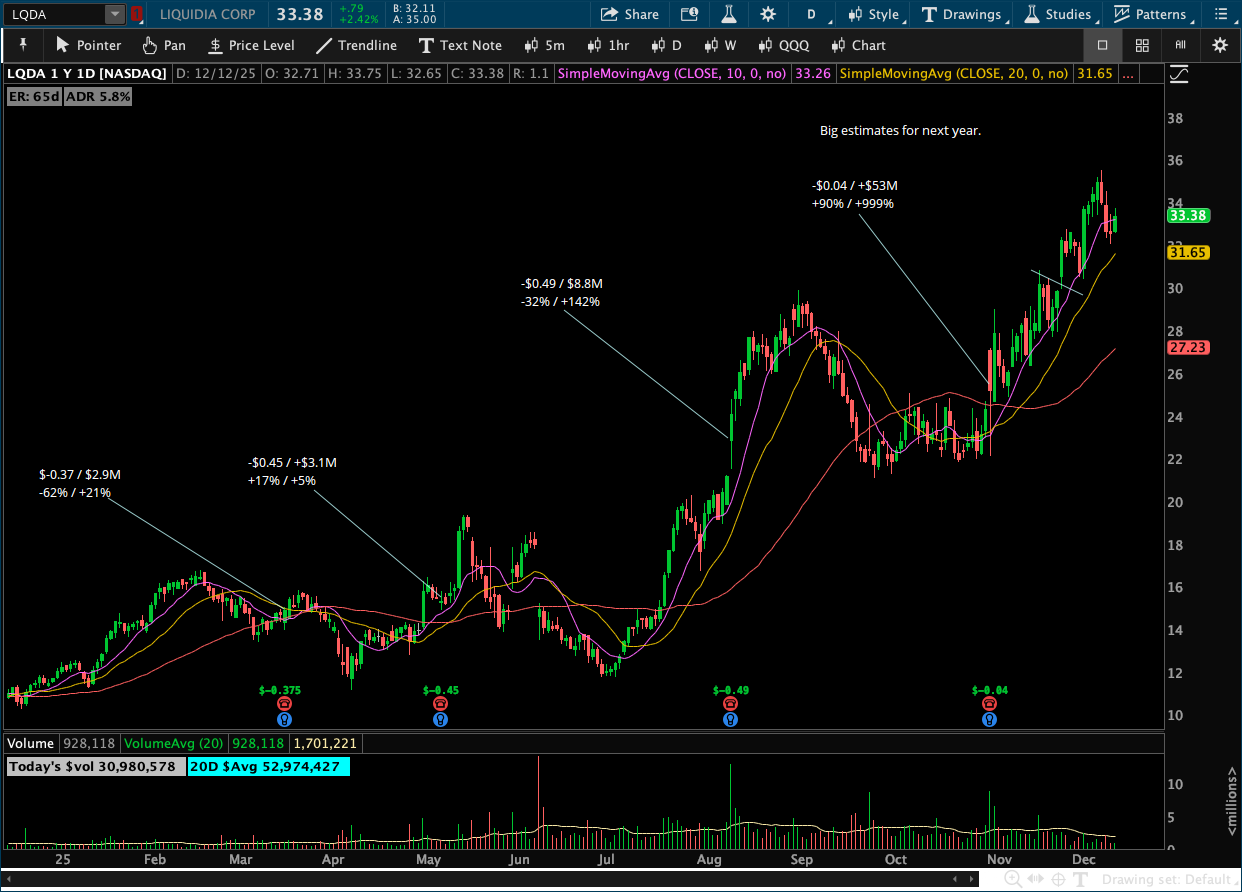 LQDA has been trending on the 10ma, waiting for some tightness. Big estimates for next year. Liquidia has seen a strong move, driven by the story of positive analyst sentiment and high price targets ahead of its potential commercialization of a key pulmonary hypertension drug.