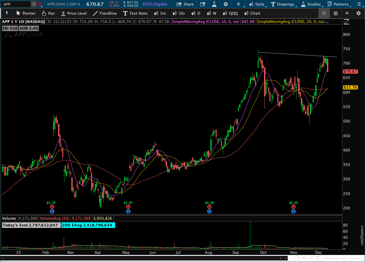 APP pulled back to the 10ma and undercut it. One of the biggest growth names from the past 2 years. Watching for a cup and handle. AppLovin is benefiting from the fundamental story of its evolution into an AI-driven, multi-channel advertising powerhouse, highlighted by strong revenue, expanding margins, and massive free cash flow generation.