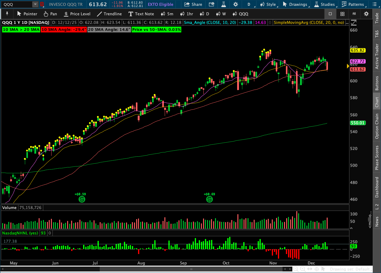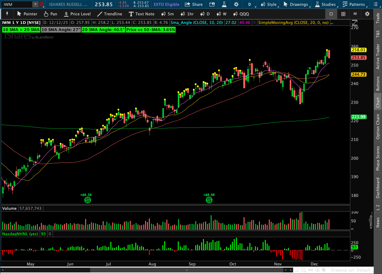 QQQ looks very vulnerable at the 50ma. Primarily led by the megacap stocks pulling back. Even though there might be some stocks setting up, my priority is to align myself with the index on the long side. With price being under the 10, and gut checking the 20 and 50, I’ll be scaling any new trades down to half size. If we start to get under the 50ma, or gap under it tomorrow, I won’t be looking to take anything new.