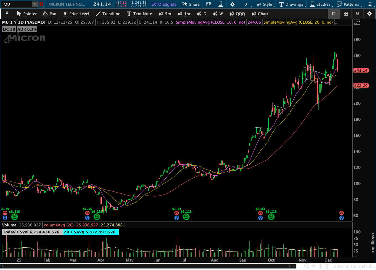 MU pulled back back through the breakout. Will be watching to see if it can start to rise the 20ma and build a good set up to take long. The stock’s strength is a fundamental story driven by surging, ‘unprecedented’ demand for its High-Bandwidth Memory (HBM) chips, which are critical components for the AI data center buildout.