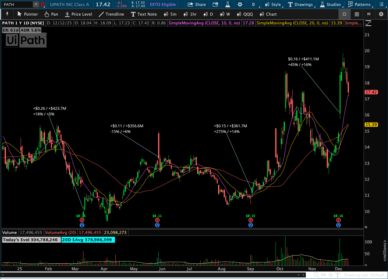 PATH watching for some higher lows off the 10ma, and a range break to take long. UiPath’s strength is based on the broader fundamental theme of surging demand for modern, AI-powered automation software, which translated into strong recent quarterly revenues.