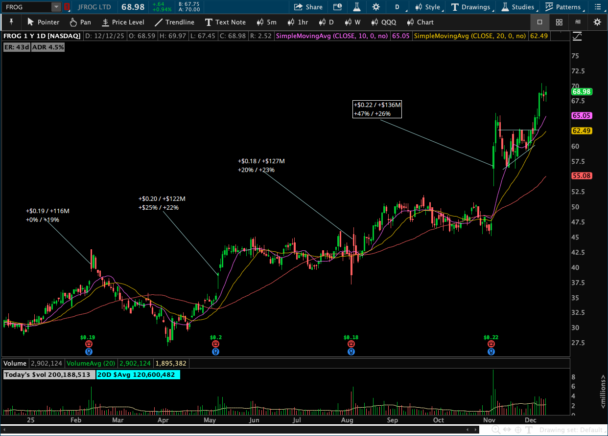 FROG pushed out of it’s 1 month base and found momentum. Has put in some tight days with the market pulling back in to the 50. JFrog’s strong performance is attributed to the fundamental strength of its software supply chain platform, particularly the robust 50% growth in its cloud business which is outperforming expectations.