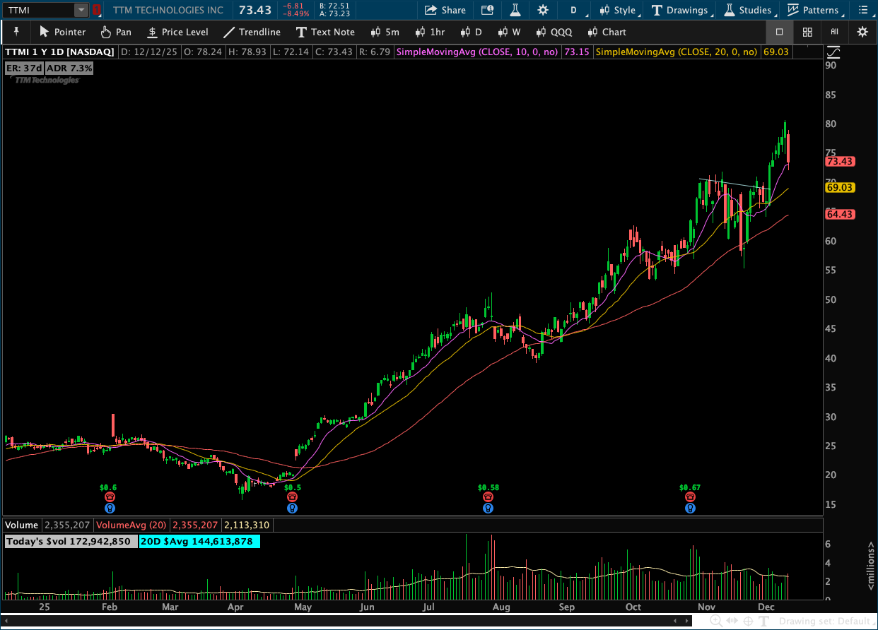 TTMI has shown RS vs the market and estimates are increasing for next year. Pulled back to the 10ma. The recent share price momentum is built on the story that TTM is fundamentally positioned to capture significant demand for advanced Printed Circuit Boards (PCBs) used in AI and cloud infrastructure buildouts.