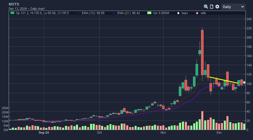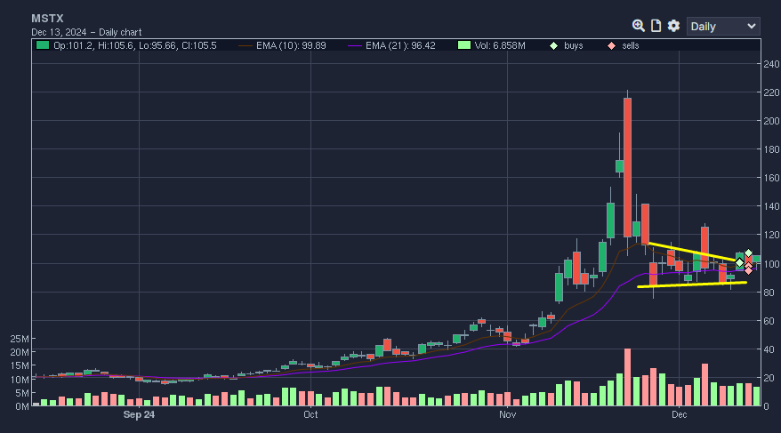 MSTX - got long once MSTR reclaimed $400. Similar thoughts to BTC on 100K. Great inside day on the daily and surfing the 21ema.
