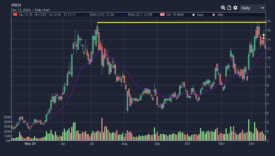 IREN - BTC related name. Tried it long after it pulled back to the 10MA and put in a tight inside day. Stopped out same day. Likely needs more time.