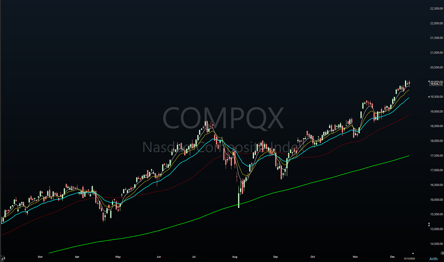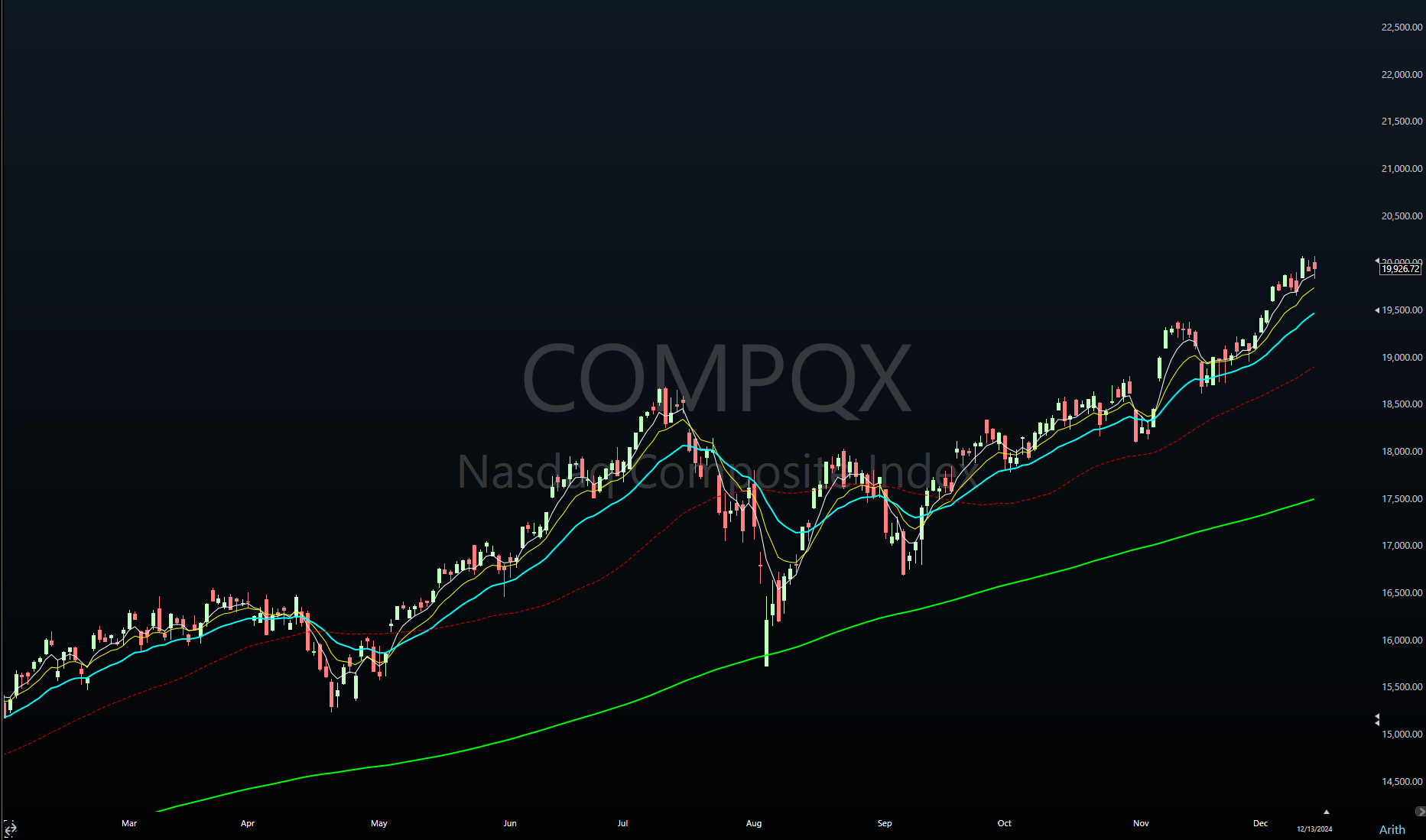 Market overall: Nasdaq composite continues to inch higher with a rising 10 over 20 moving average.