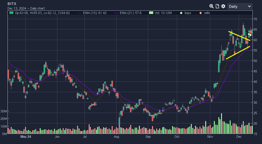 BITX - have been using 100k as the line in the sand for BTC. Once it reclaimed and broke out, I got long and added the next day on the dip. Currenly my stop is the low of 12/11 on all shares.