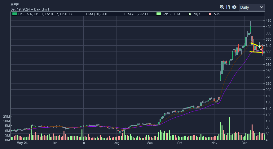 APP 0.00%↑ - a true market leader that has had a monster run and pulled back to the 21ema and no longer extended. Got long on the break of it’s range and got stopped out the next day.