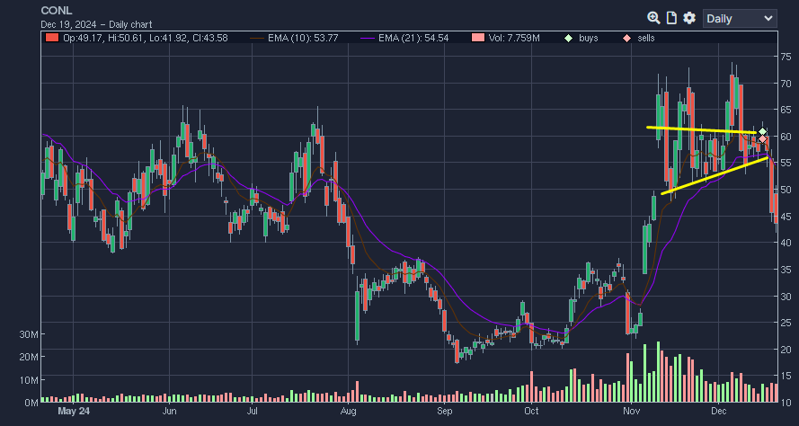 CONL 0.00%↑ - The idea here was that it was coming out of it’s range, and BTC was over 100k. Quickly got stopped out.