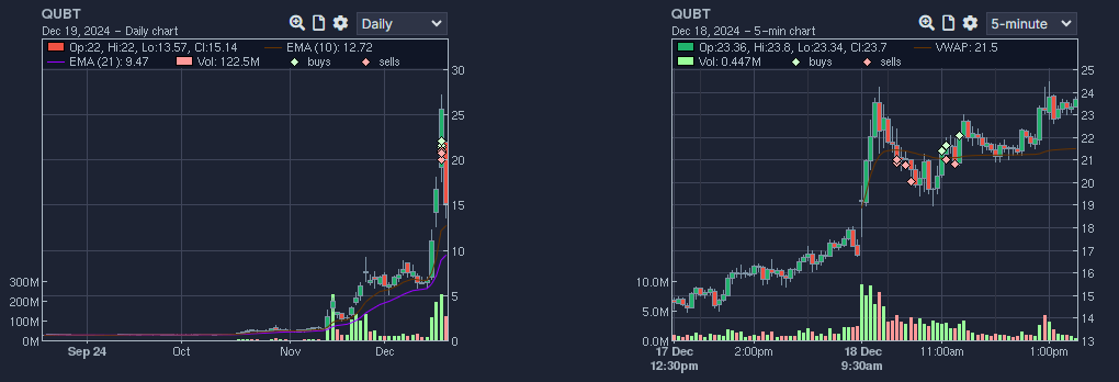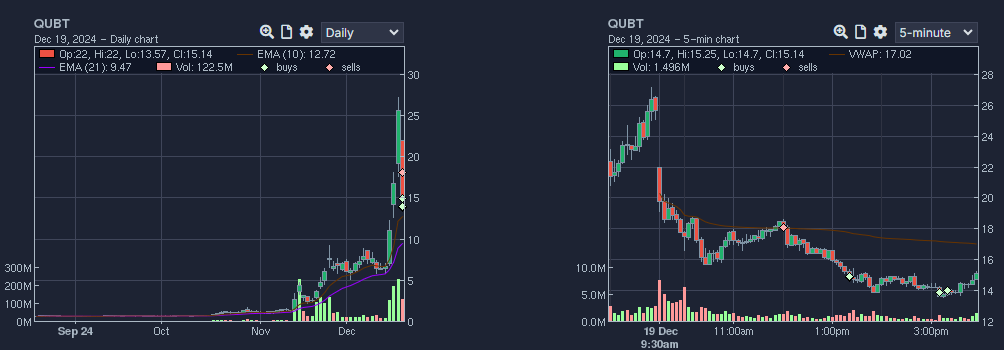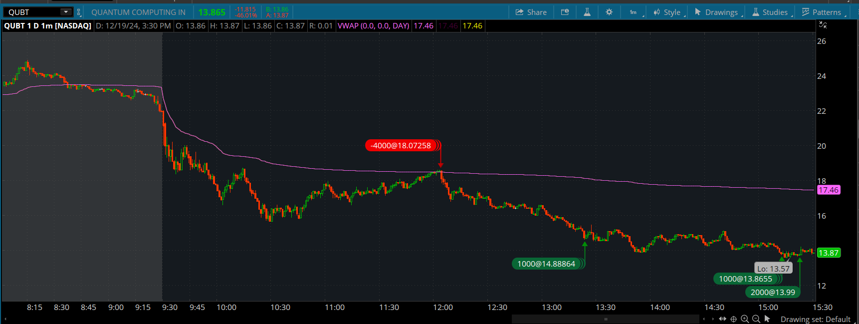 QUBT 0.00%↑ - gapping down today and is a more difficult short for that reason. I didn’t touch it all morning, until it slowly made it way to vwap. I wanted to be very precise on my entry as there was a lot of confluence at $18 (it marked the high of 12/17, roughly the low of 12/18, and most importantly todays vwap). Once it kissed vwap it very aggressively yanked down and that’s where I entered. My first target was under LOD if it was aggressive enough. Once it couldn’t get under the last lower low of $14, I covered the rest of my shares. I made half of what was lost on yesterday’s short, but happy to keep a level head through the trade and move on.