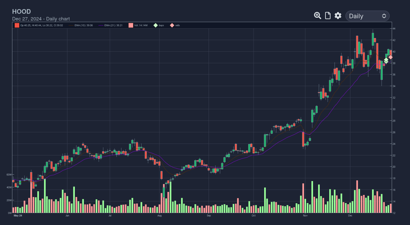 HOOD 0.00%↑ - bought it as it was coming off the 21ema on a tight inside day. Booked it for a small gain on Friday.