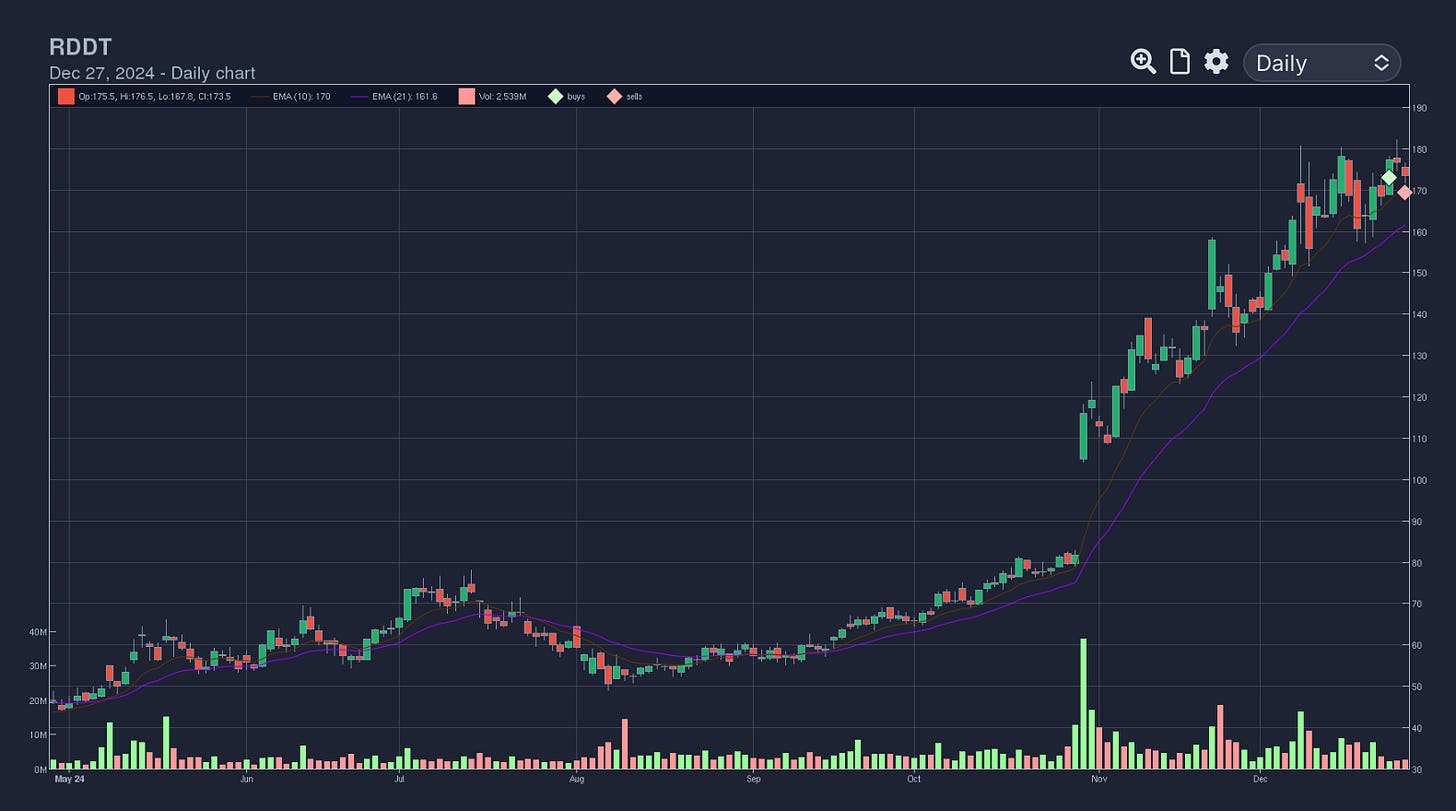RDDT 0.00%↑ - one of the leaders that I’ve been trying to get back into. Was able to get it on tight risk, it made a good move, but not enough to sell my first piece. Ended up getting stopped out on it on Friday.