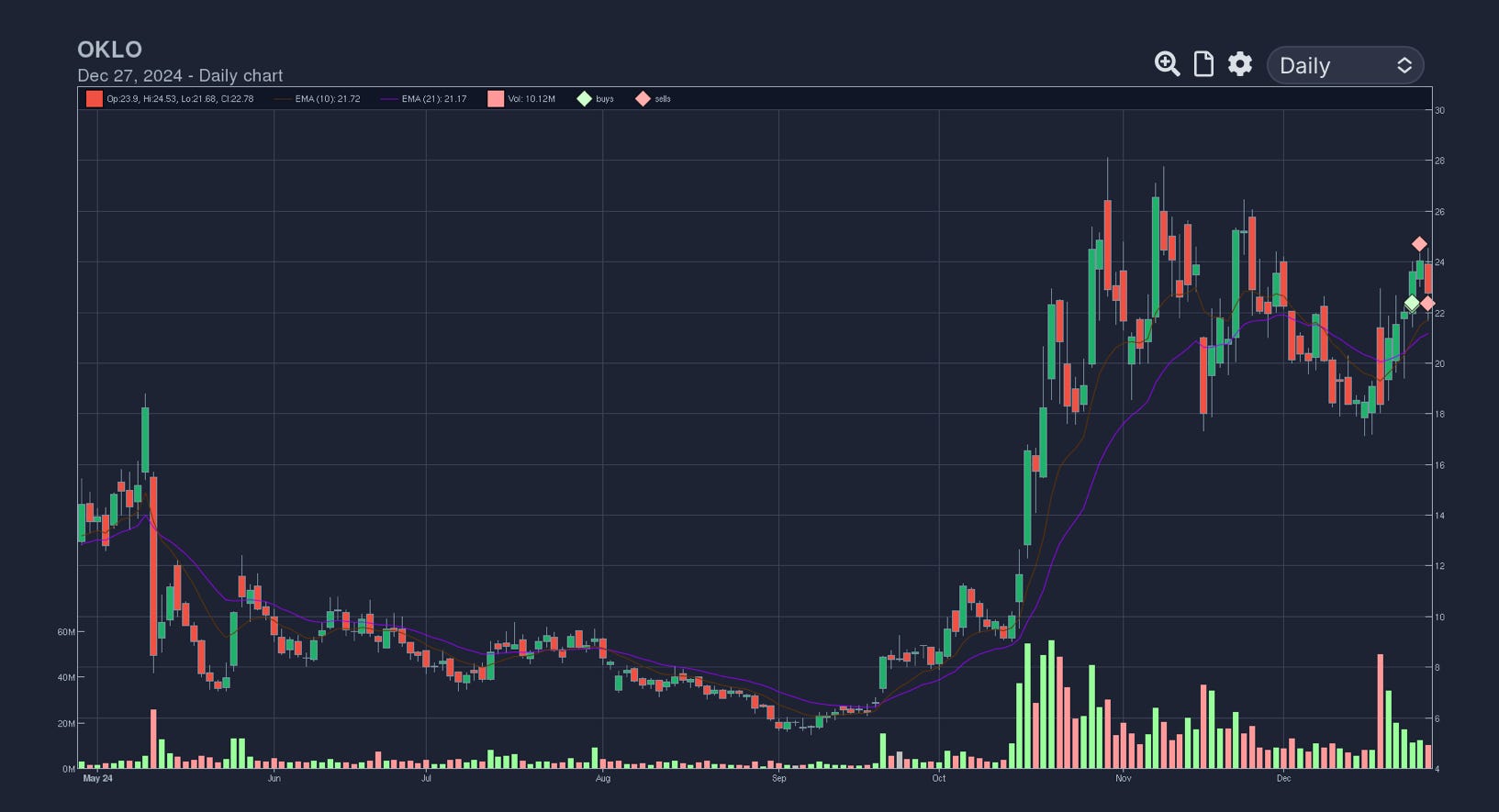 OKLO 0.00%↑ - had news last week, bought it this week as it was breaking a range around 22. Sold some into strength and got stopped on the rest at b/e.