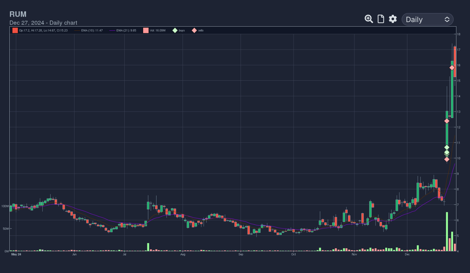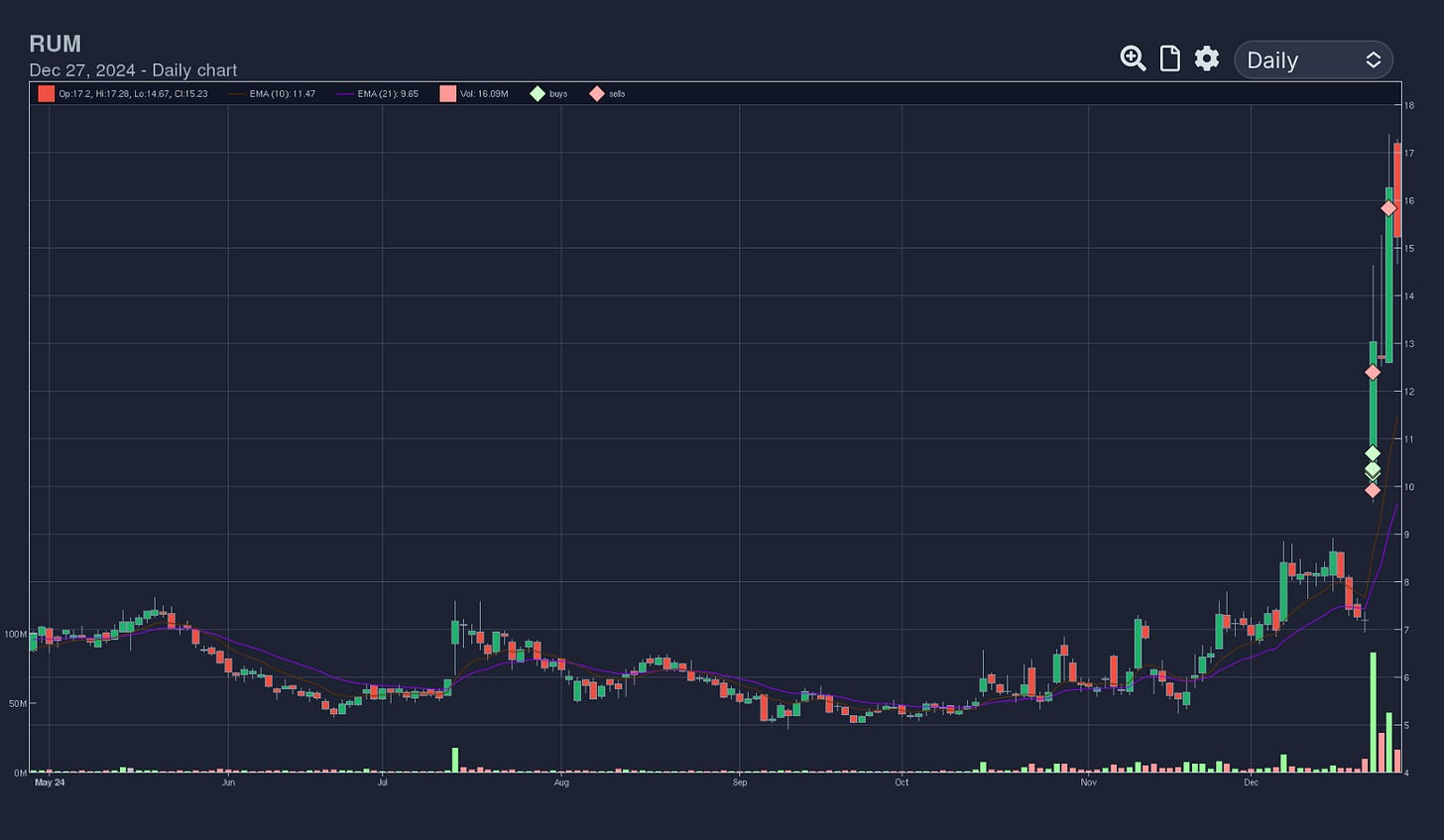 RUM 0.00%↑ - catalyst, rvol, neglected chart. Entered long on d1, got stopped out of some shares, and rebought them back. Have sold into strength and carrying over 1/3 of my position into next week.