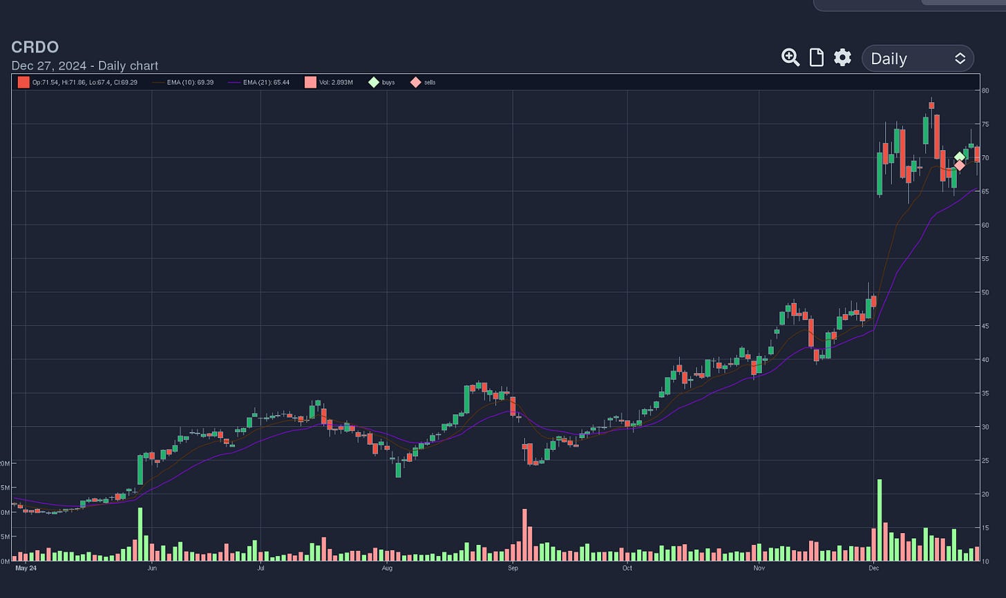 CRDO 0.00%↑ - post earnings pullback give the 21ema, got stopped out for small loss. Still watching it if it continues to build a range.