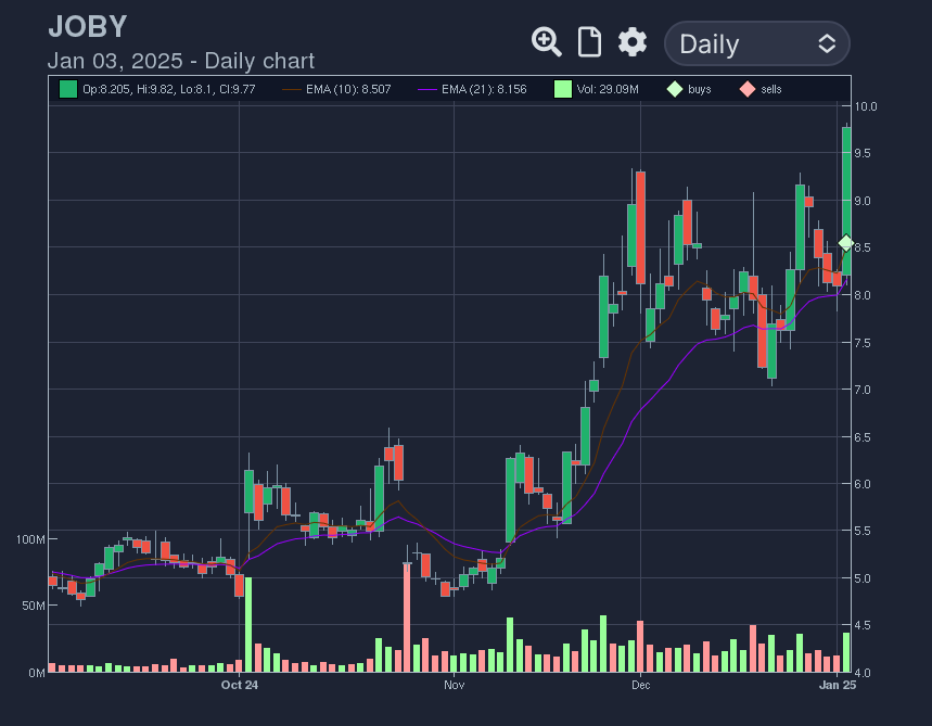 JOBY 0.00%↑ - One of the strong eVTOL thematic names in the market. Was a little late on the entry as prior day highs would have been the prime entry. Paid up and showed good follow through. Willing to sit and let it work if/when the other eVTOL names start moving along.