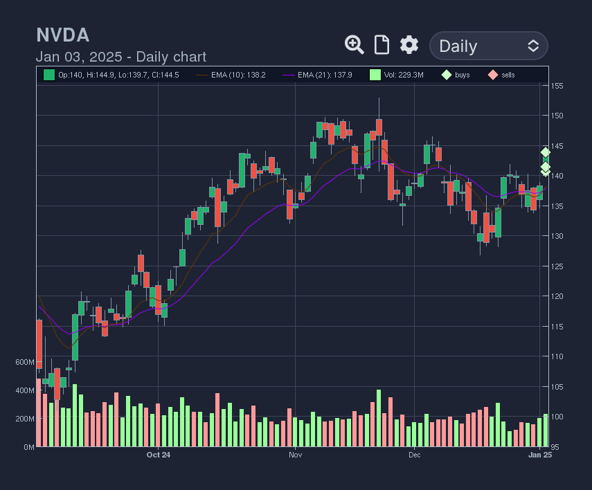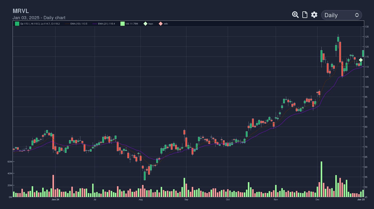 MRVL 0.00%↑ - After an earnings gap up over ATH, and consolidation, this name presented with an inside day off the 21ema. The estimates for 2025 are very good.