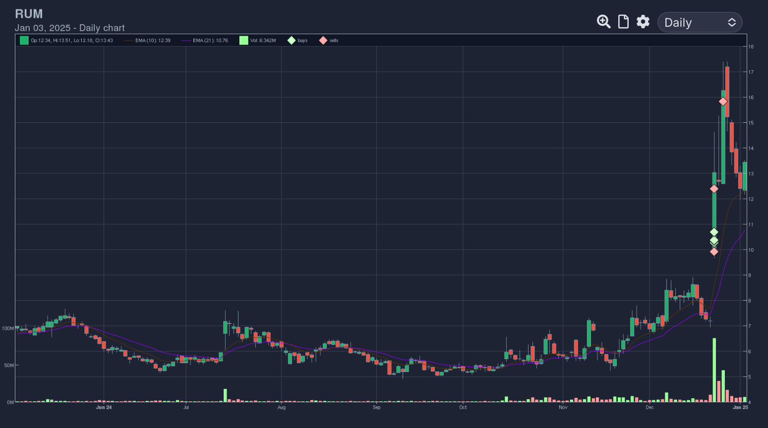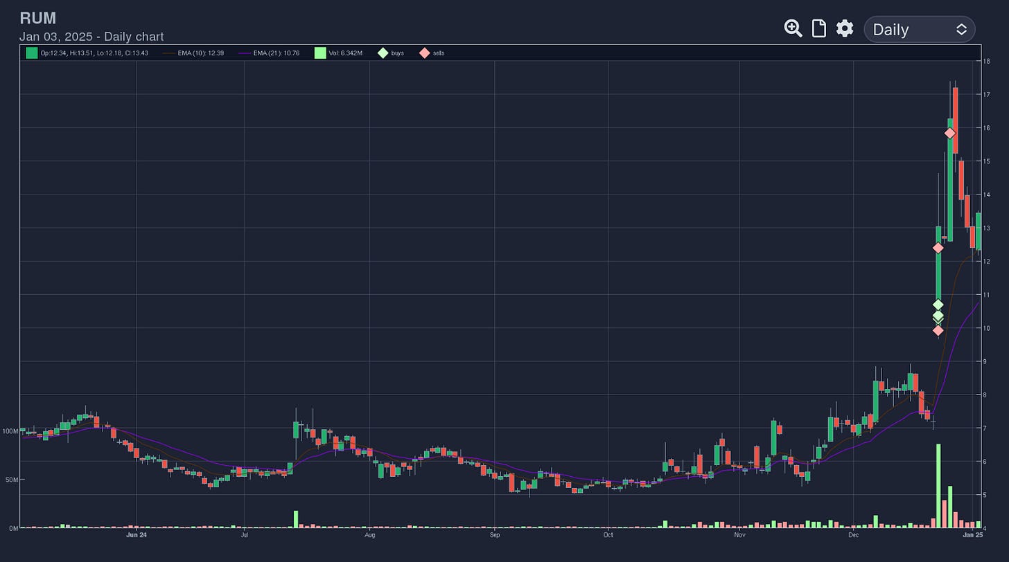RUM 0.00%↑ - Partial left in RUM and trailing moving averages. Trying to let MA’s guide me on trails as much as I can. Attempting to outsmart them has led to missing out in significant gains.